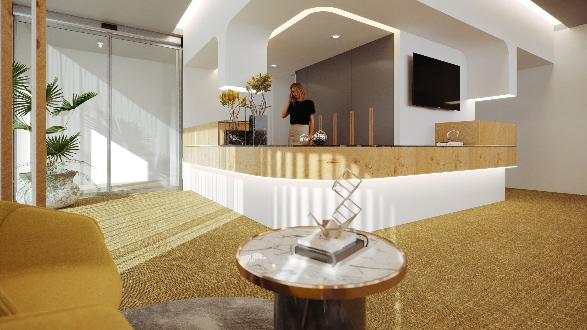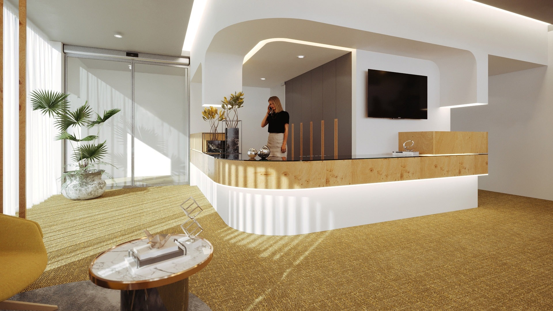The service desk, as in any other space, will have a dual function. To welcome those arriving and greet those leaving. As such, two moments are created at the same counter. A reception area and a payment area. The design for the dental clinic once again uses intellectualized filters, giving greater privacy in the payment area.