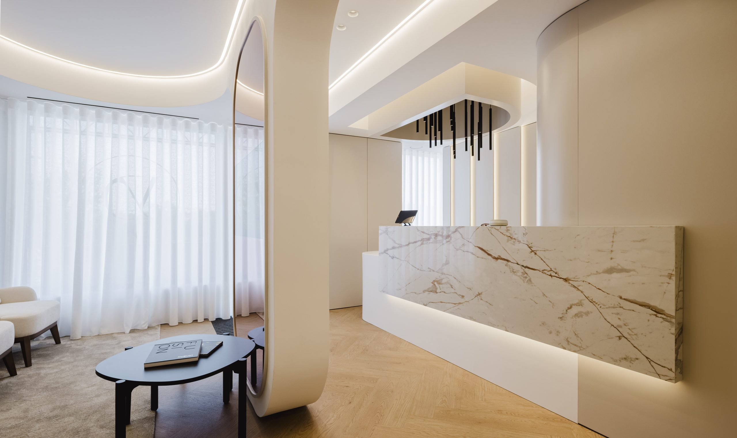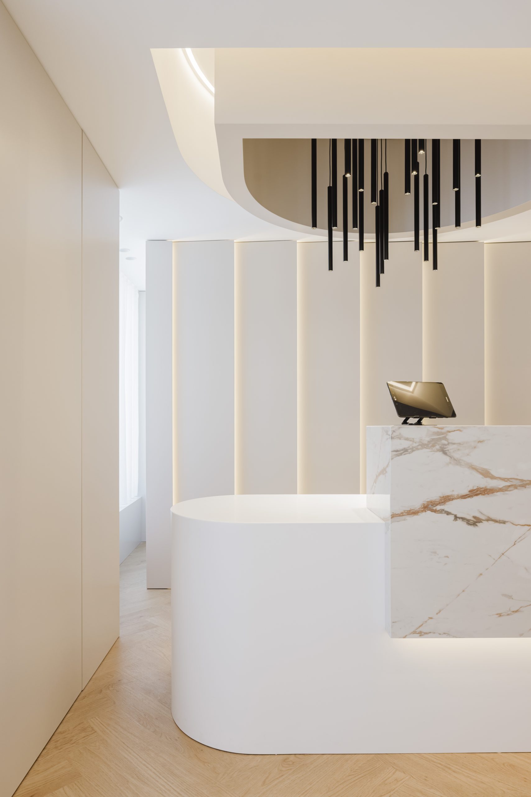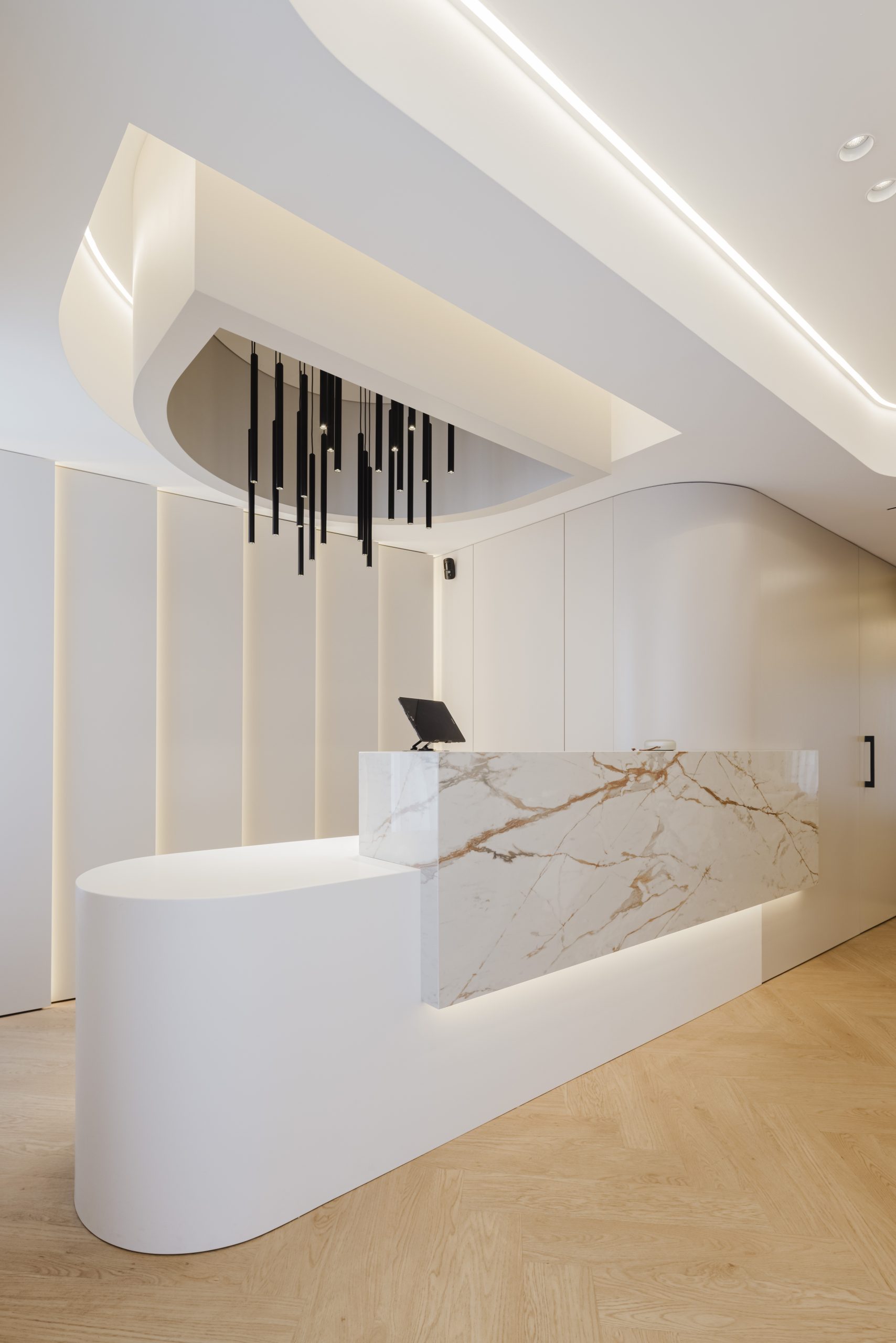 A receção foi desenhada como elemento cénico e acolhedor, com balcão curvo em branco mate, frente em mármore iluminado e pendentes verticais que criam profundidade visual.