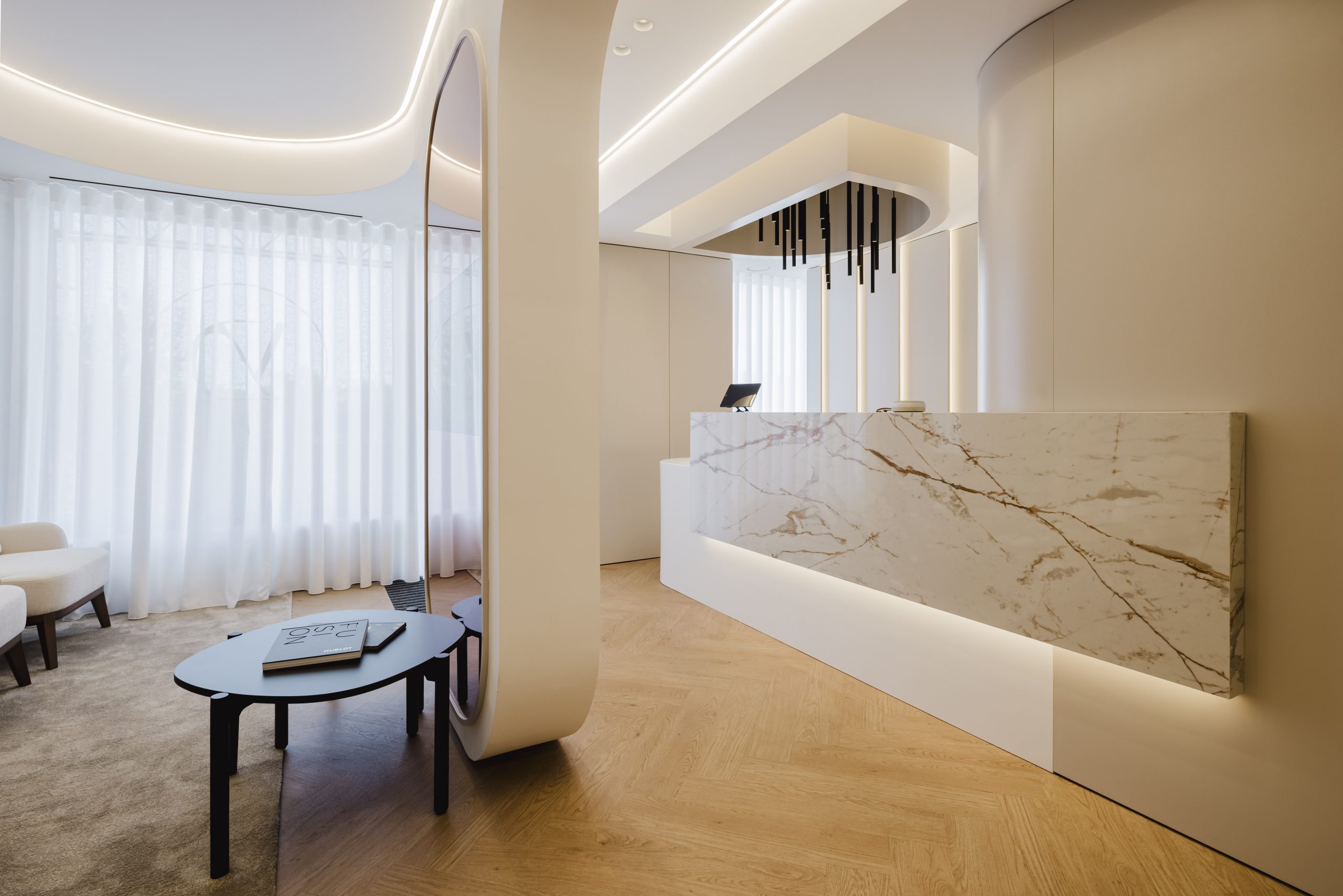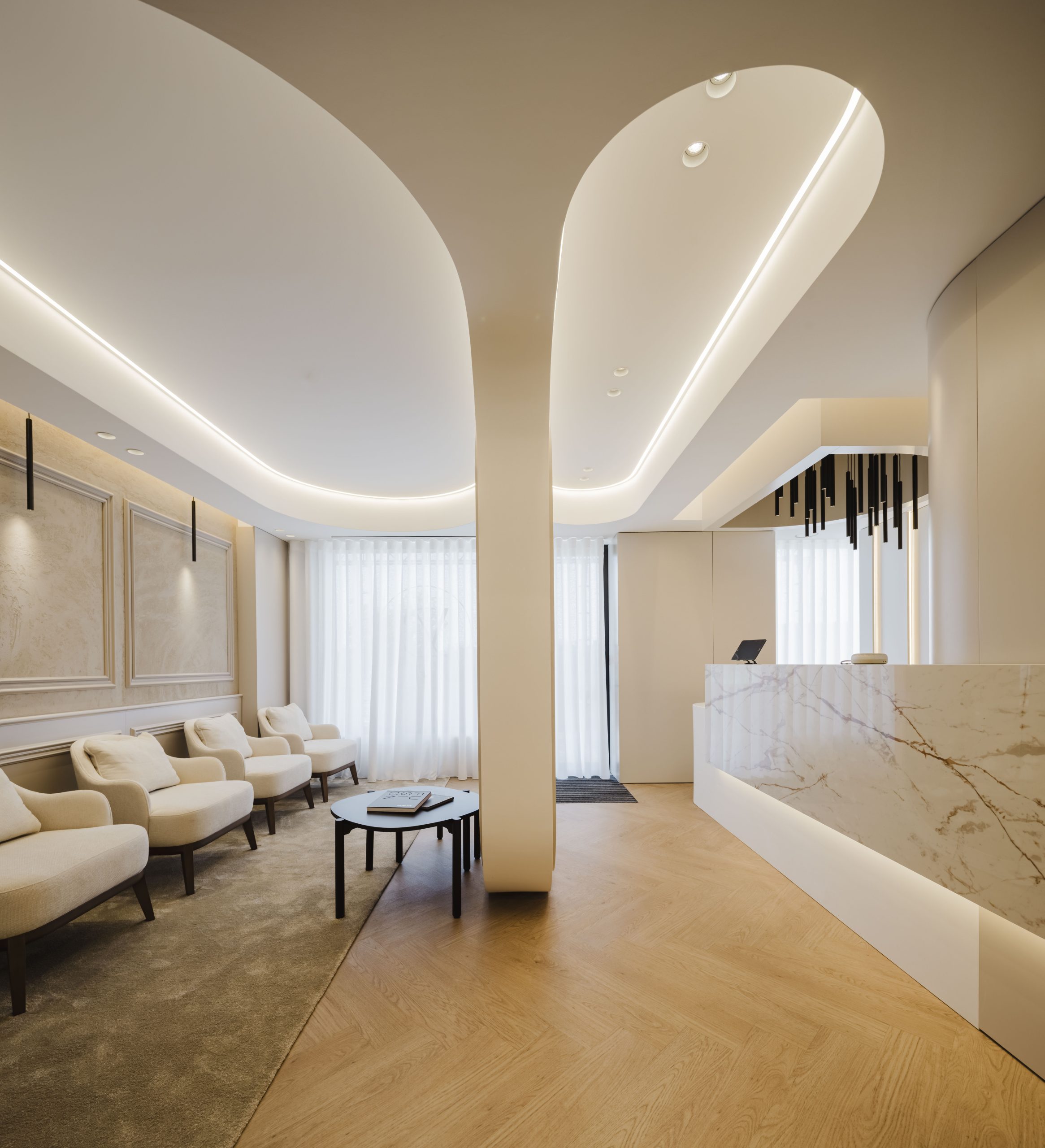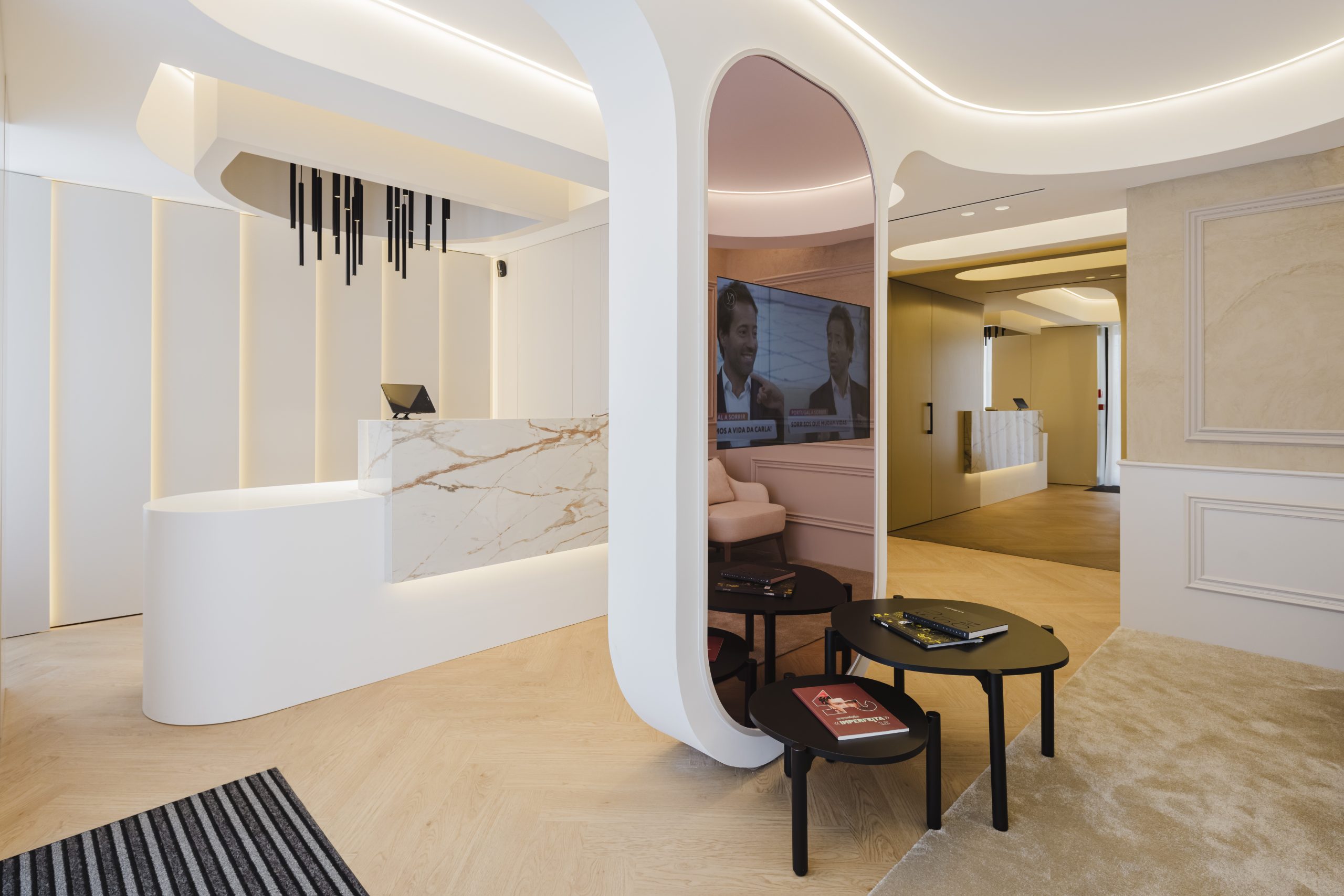A receção foi desenhada como elemento cénico e acolhedor, com balcão curvo em branco mate, frente em mármore iluminado e pendentes verticais que criam profundidade visual.