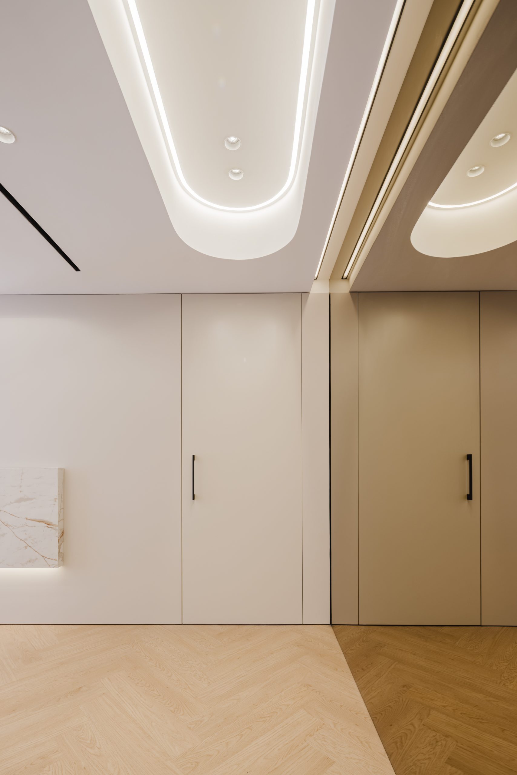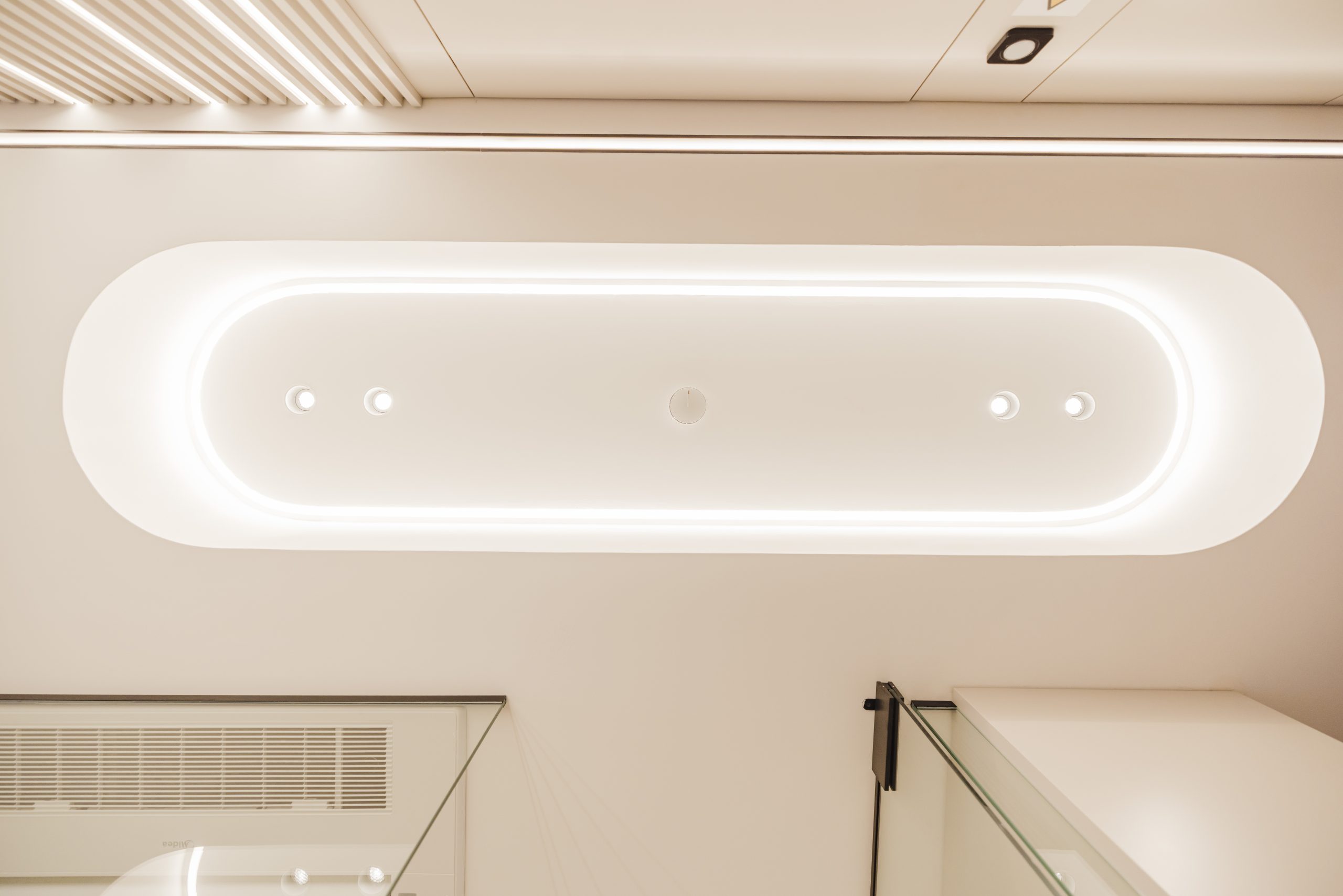 A iluminação é multilayer, combinando sancas contínuas, luz linear, iluminação circular suspensa e luz ambiente periférica para criar atmosfera suave e acolhedora.