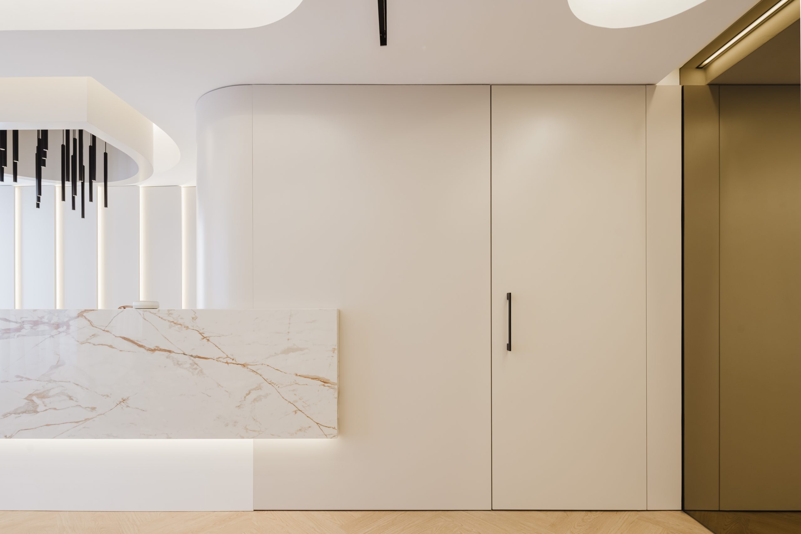 A receção é o primeiro ponto de contacto emocional com o espaço. O balcão apresenta uma base curva em branco mate e um volume frontal em efeito mármore. A iluminação inferior cria a sensação de flutuação. Para complementar, pendentes verticais introduzem profundidade visual e um toque escultórico.