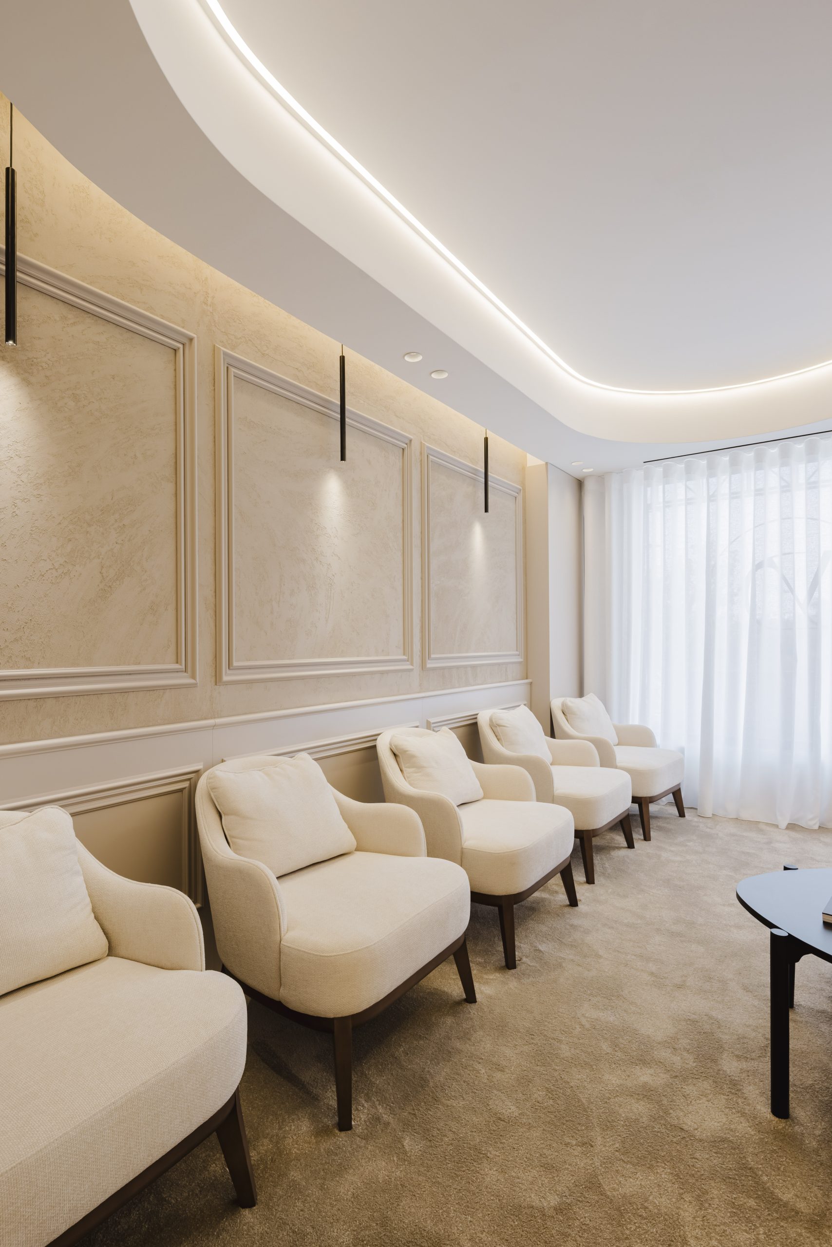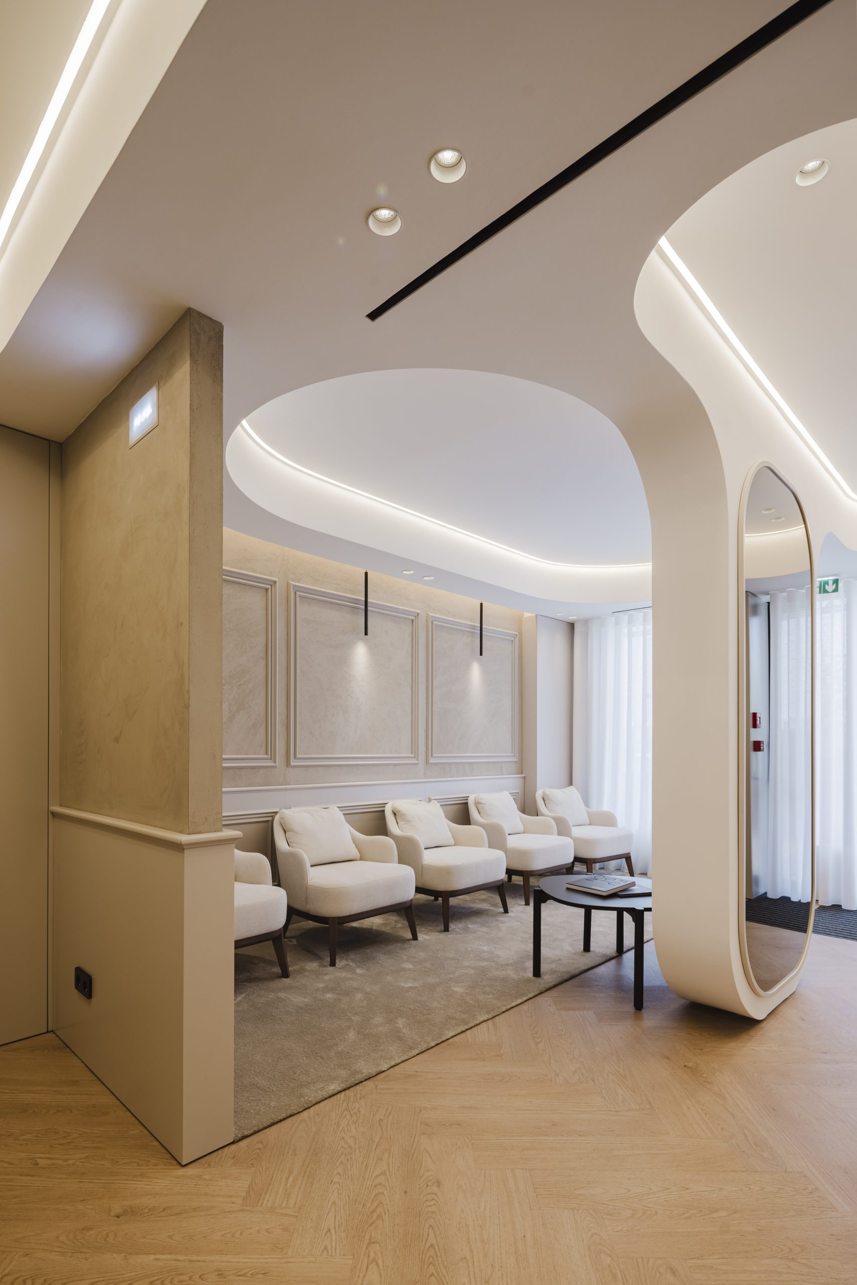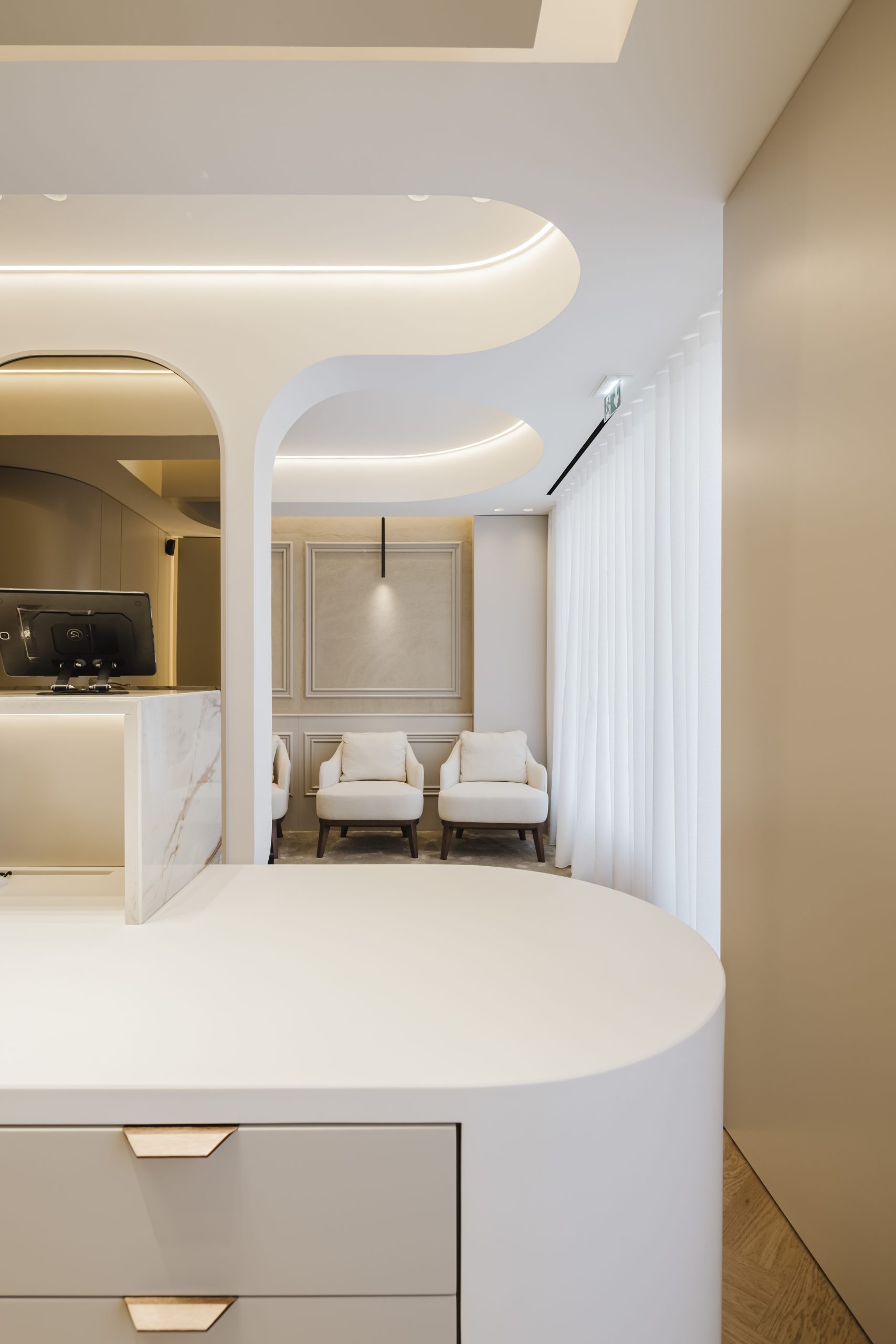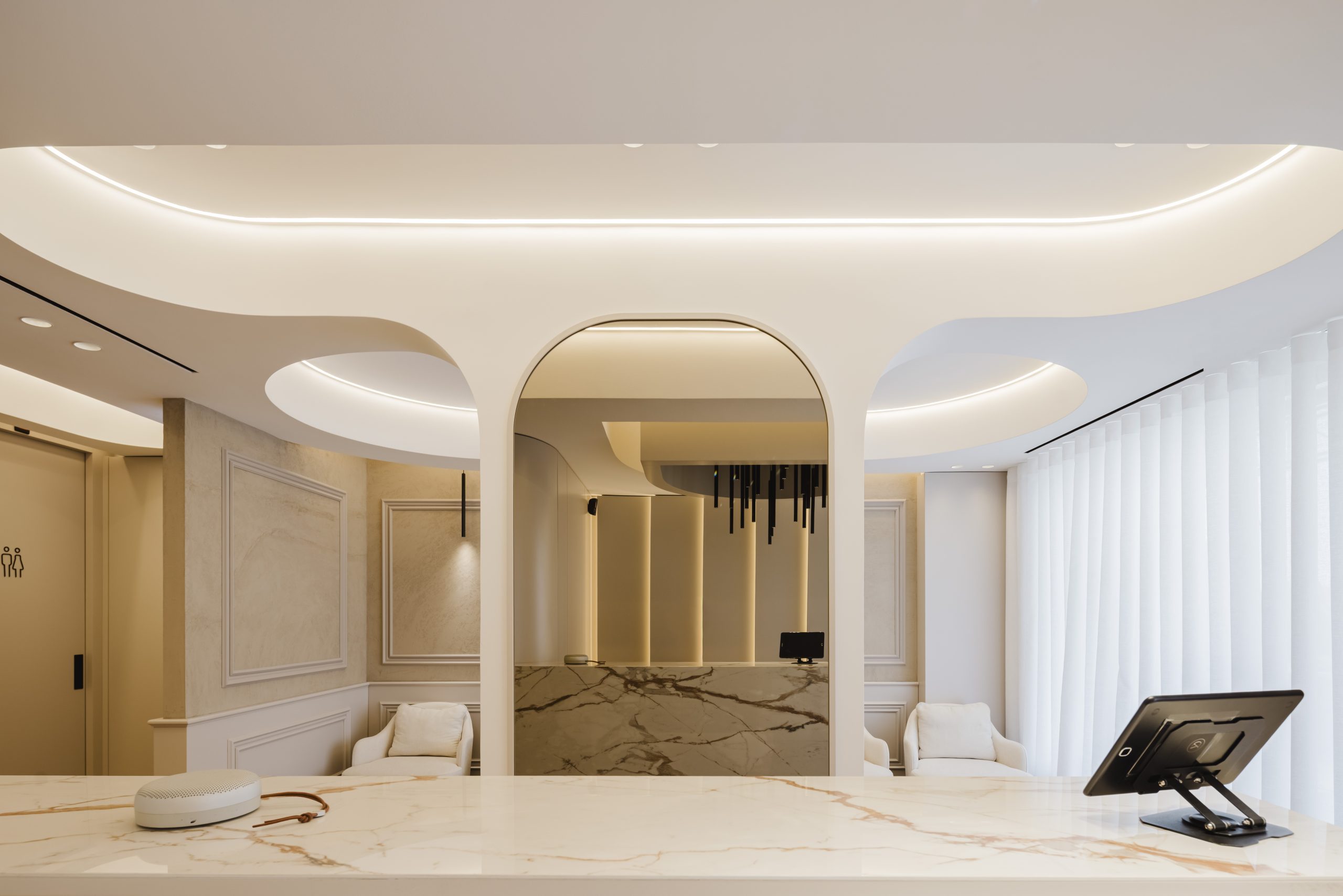 A transição entre a sala de espera e os corredores faz-se através de elementos arquitetónicos curvos. Estes portais suaves reforçam a narrativa orgânica da clínica e tornam o percurso mais harmonioso.