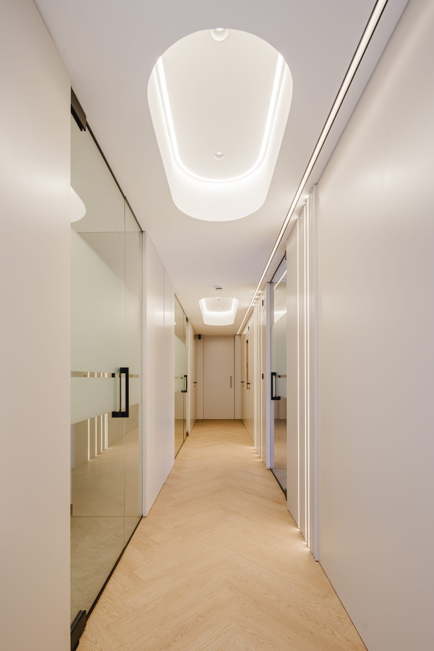 O corredor principal prolonga a sensação de serenidade que se sente na entrada. O pavimento em madeira clara cria continuidade, enquanto os rasgos de luz linear acompanham o percurso. Assim, o visitante mantém uma orientação intuitiva e confortável durante todo o caminho.