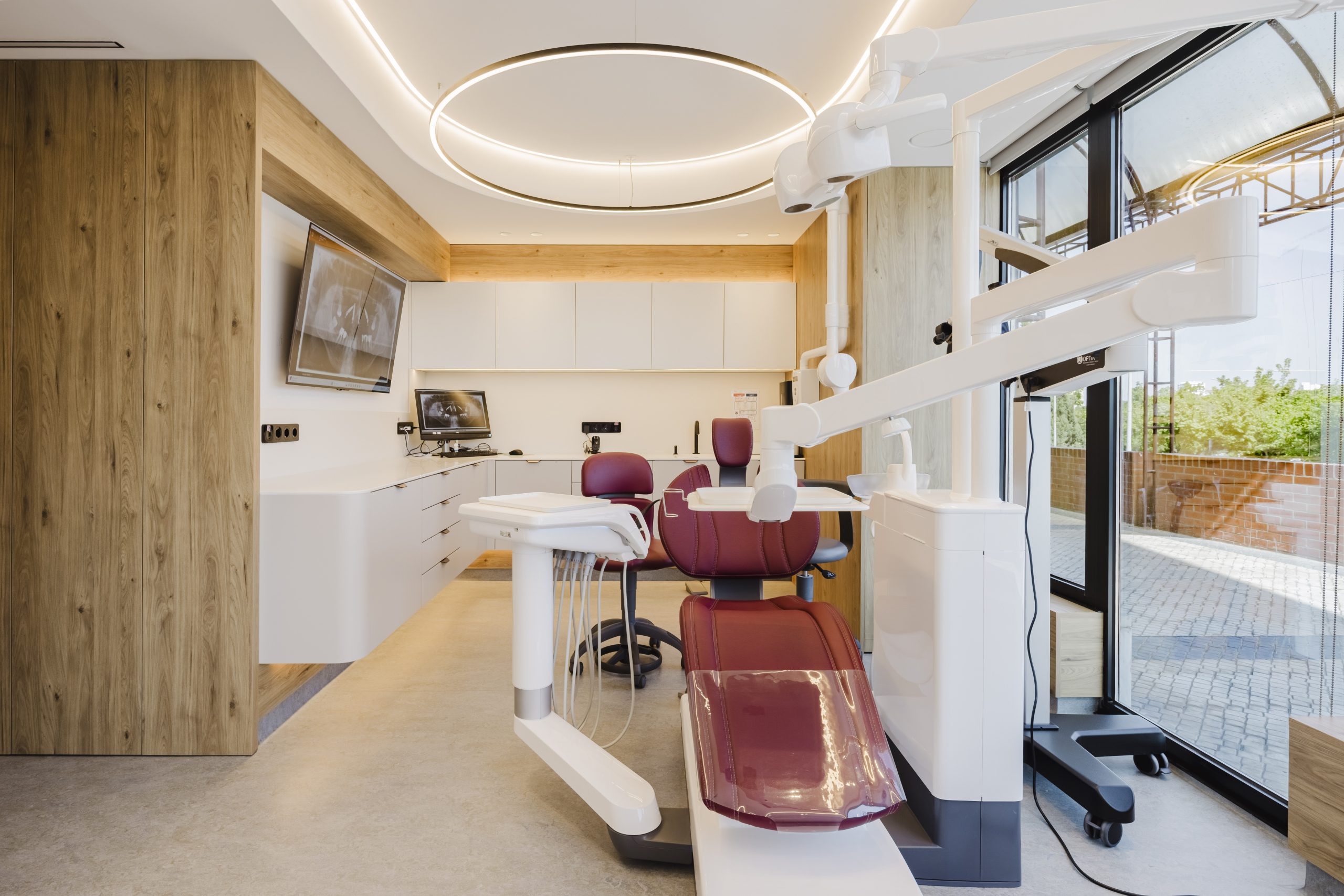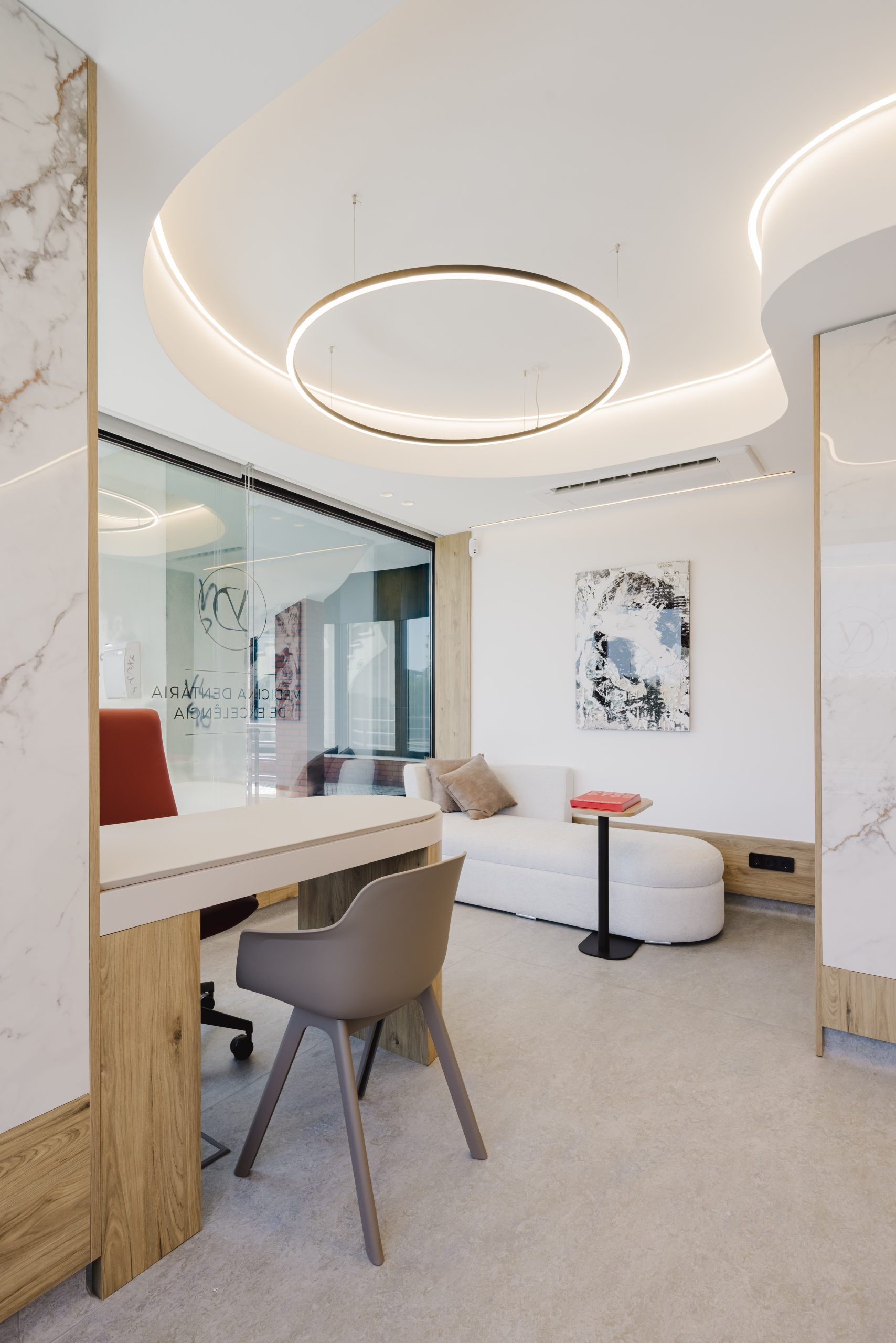 A clínica dispõe de três consultórios desenhados com foco na ergonomia e na eficiência. Cada gabinete inclui luz natural abundante, equipamento dentário de última geração e iluminação circular suspensa. Além disso, integra luz ambiente periférica, armários minimalistas e superfícies higienizáveis de elevada durabilidade. Como resultado, os espaços garantem funcionalidade e higiene sem comprometer o conforto visual.